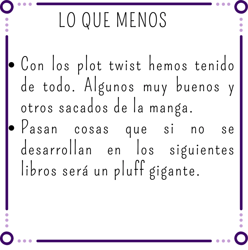 Así que sí, hay plot twist que nos los hemos comido, pero algunos eran tan obvios que pensábamos que no podía suceder así, y fijate que hasta nos sorprendieron. Otros no los vimos venir ni de lejos, aunque tenemos que decir que aunque entendemos algunos de los giros que pasan, otros no vimos la necesidad o los vimos un poco sacados de la manga.