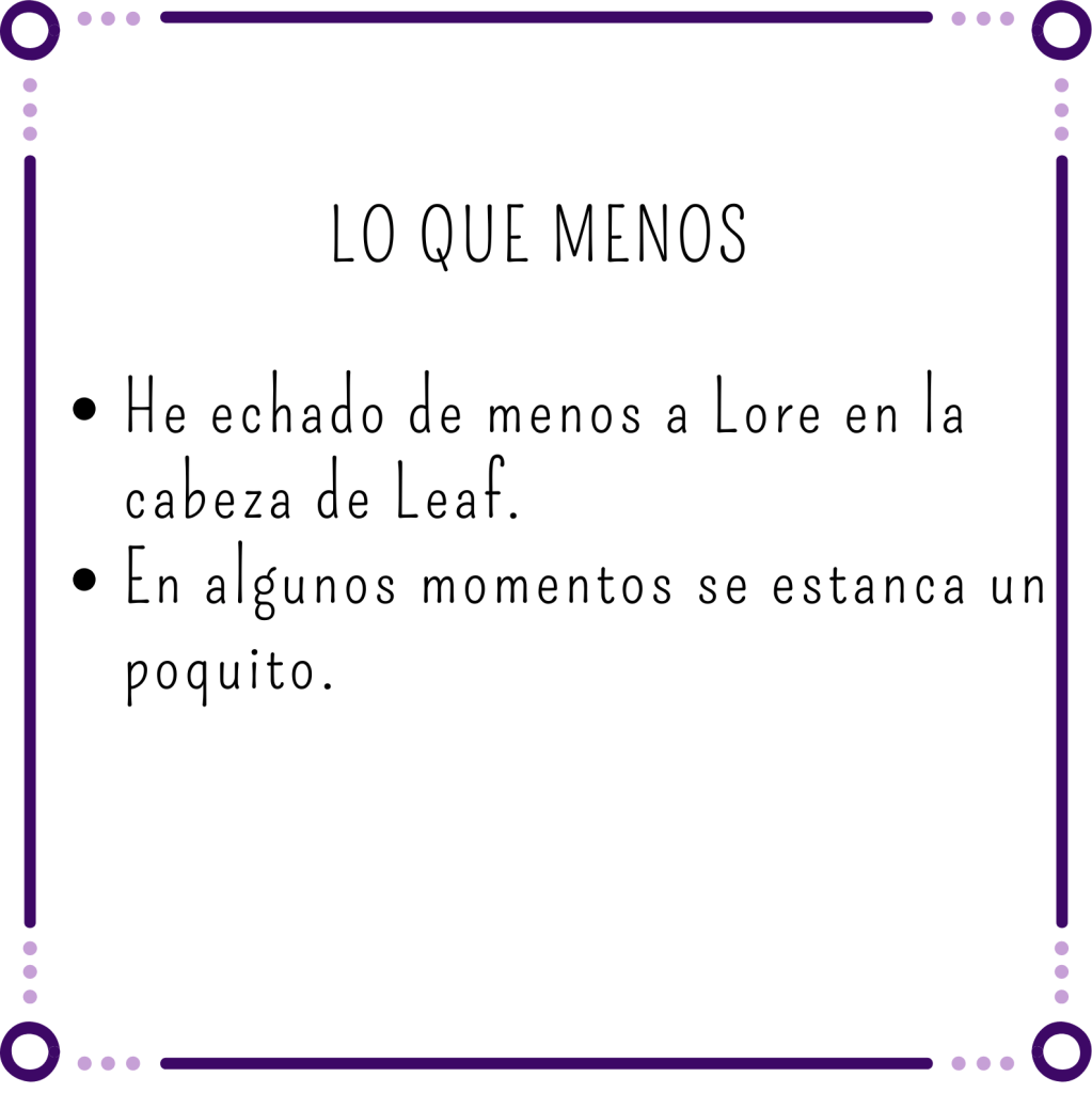 Quizá en este libro he echado de menos más presencia de Lore, que es mi favorito, aunque se compensa un poco porque Crain y Zero han ganado mucho peso y cada vez me gustan más.