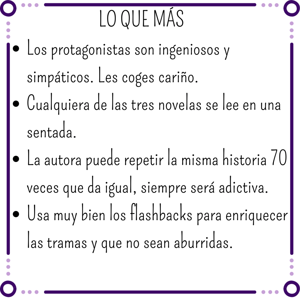 Creo que ese enganche es gracias a la pluma de la autora, que puede repetir la misma historia 70 veces que da igual, siempre será adictiva. Se leen rápido, con una sonrisa puesta y dejan una sensación bonita en el cuerpo.