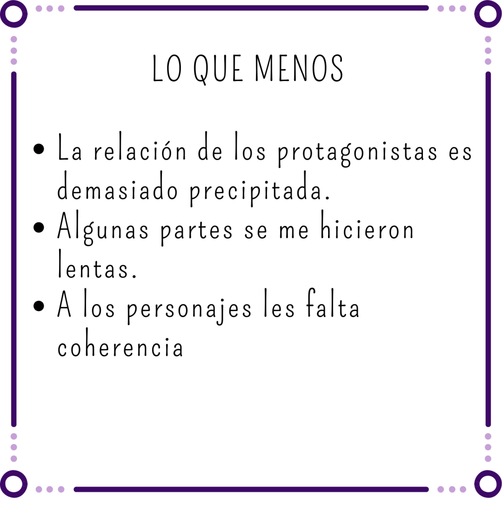 Me esperaba mucho más de la historia, que no está mal, pero sus personajes no han terminado de convencerme y ha hecho que todo lo demás me chirriara.