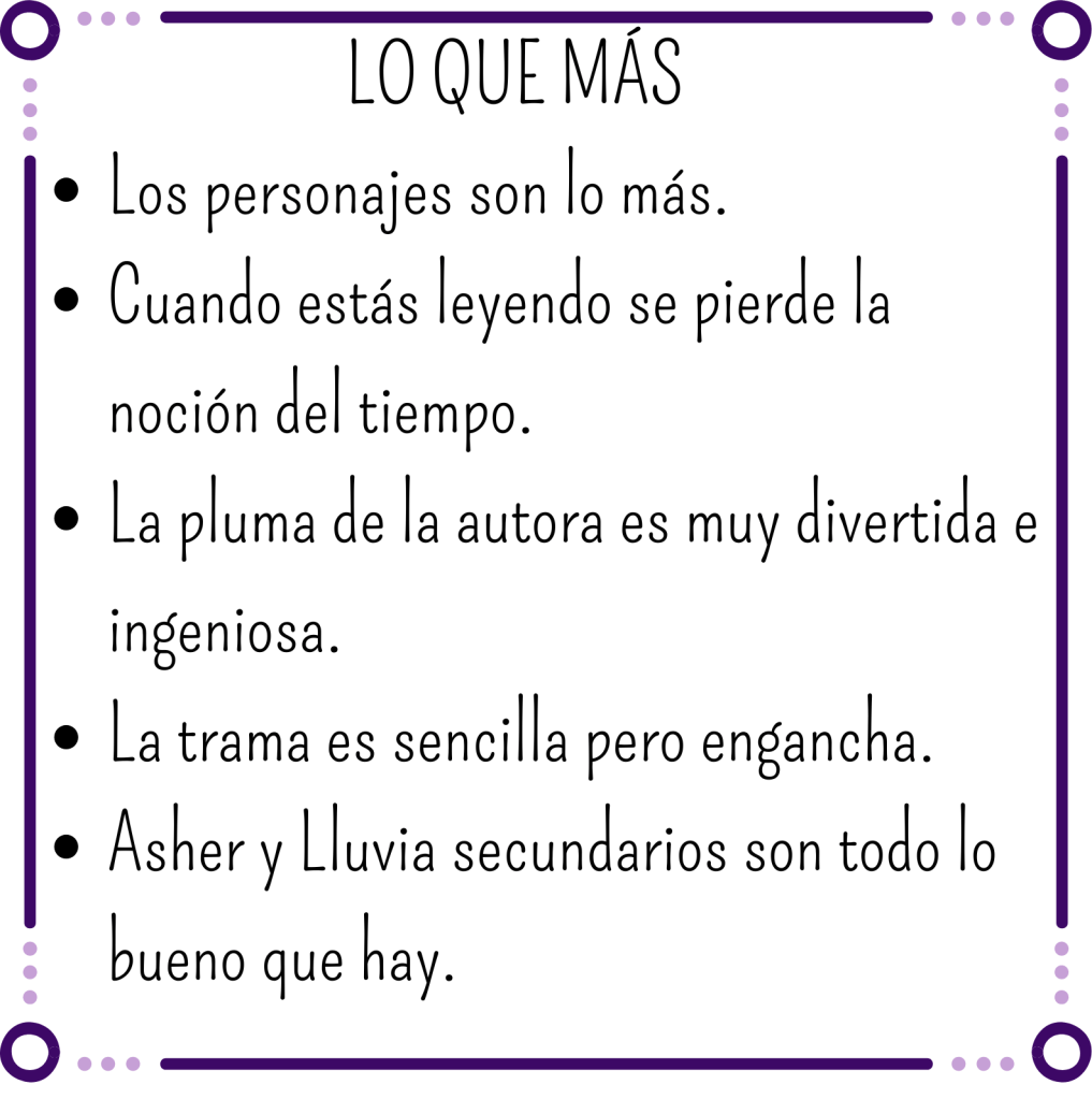 La tensión que tienen y cómo evoluciona su relación nos ha gustado mucho. Además, nos parece maravilloso que Lluvia y Asher sean los secundarios en este libro, haciendo un montón de referencias a ¨Corazón en fuera de juego¨ (así que recomendamos leer el anterior para entenderlas)