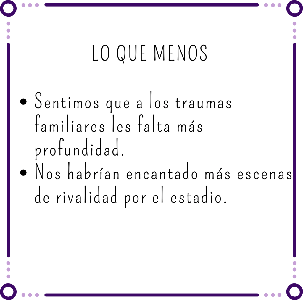Aunque con el tema de los traumas familiares quizás buscábamos un poco la sorpresa y la profundidad en los personajes. Creemos que como idea está bien pero tampoco se desarrolla demasiado. Sin esa subtrama tampoco habría cambiado demasiado el argumento.