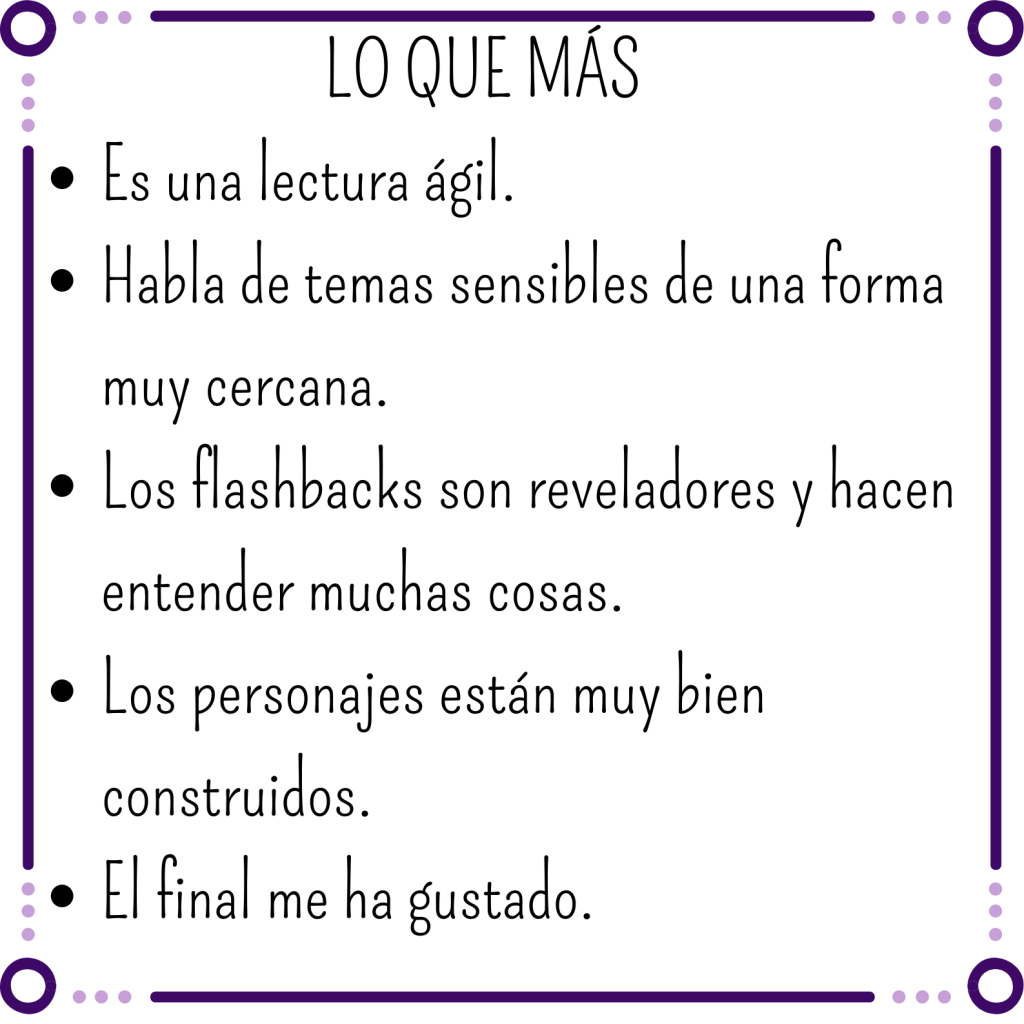 El ritmo de lectura me ha parecido bastante ágil, porque aunque lo que cuenta es muy duro, la forma de narrarlo es muy ligera (eso no le ha quitado peso a lo que sucede). También tengo que decir que a veces tenía que hacer parón porque no quería seguir leyendo. Hay escenas que ponen mal cuerpo.