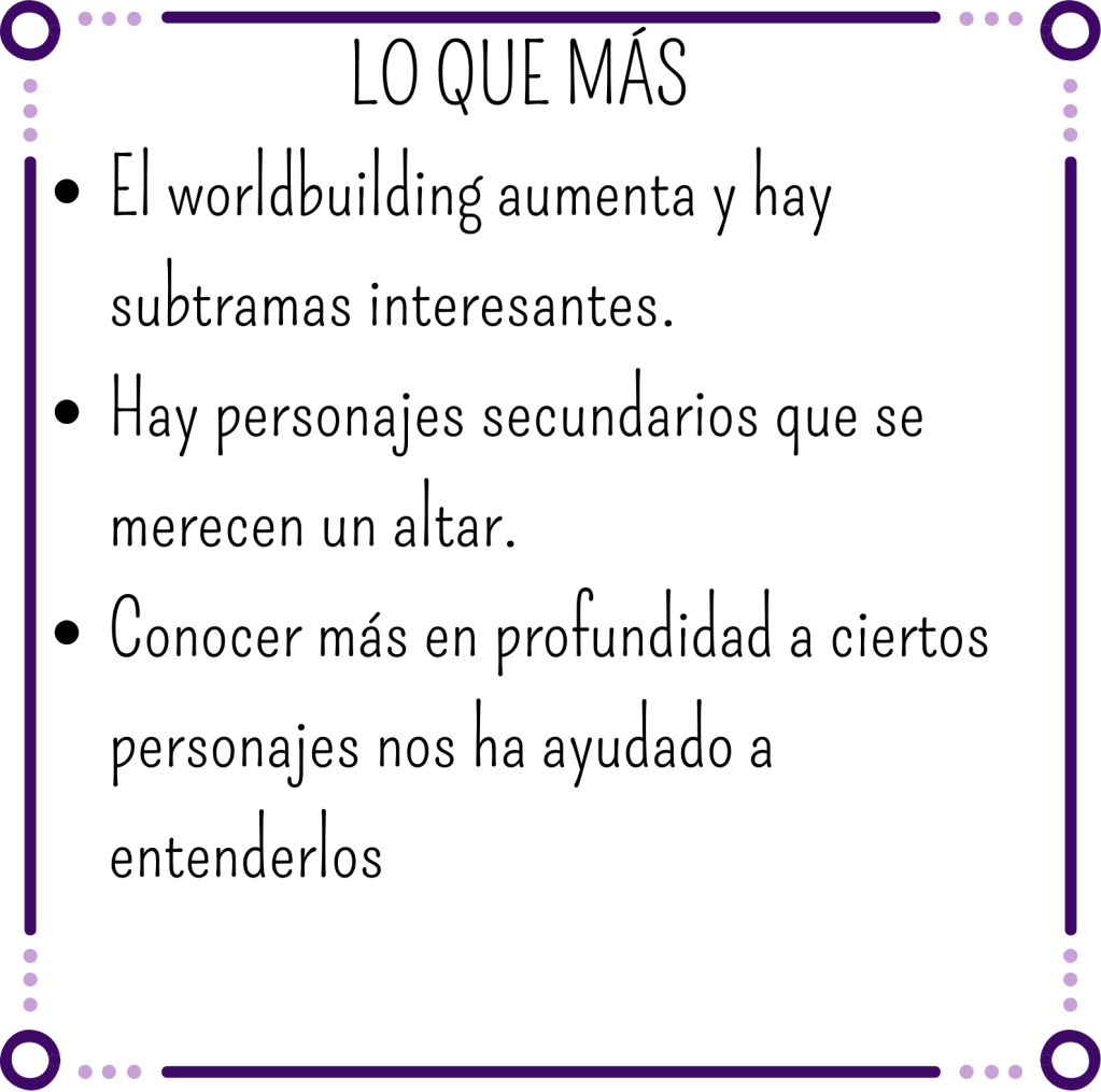 En este libro descubriremos a personajes nuevos y conoceremos en profundidad a algunos antiguos. Por lo tanto hemos notado ese aumento de complejidad en el worldbuilding que nos ha gustado mucho.