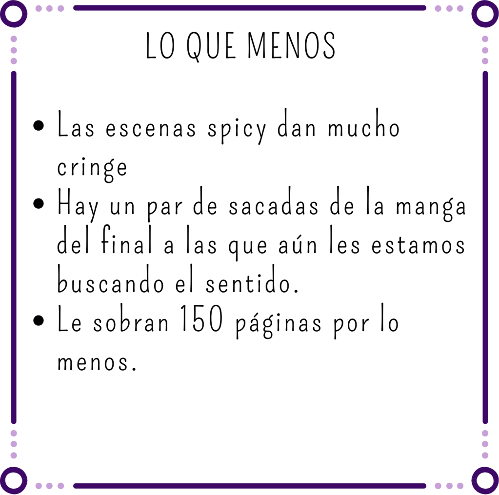 De cara al final, sí que hay un cambio de ritmo notable, y las últimas 40-50 páginas se leen en un suspiro. Hay cosas del final que nos han encantado y otras que sinceramente nos ha parecido una fumada muy grande. Aun así acaba de una manera que te deja con toda la intriga para continuar.
