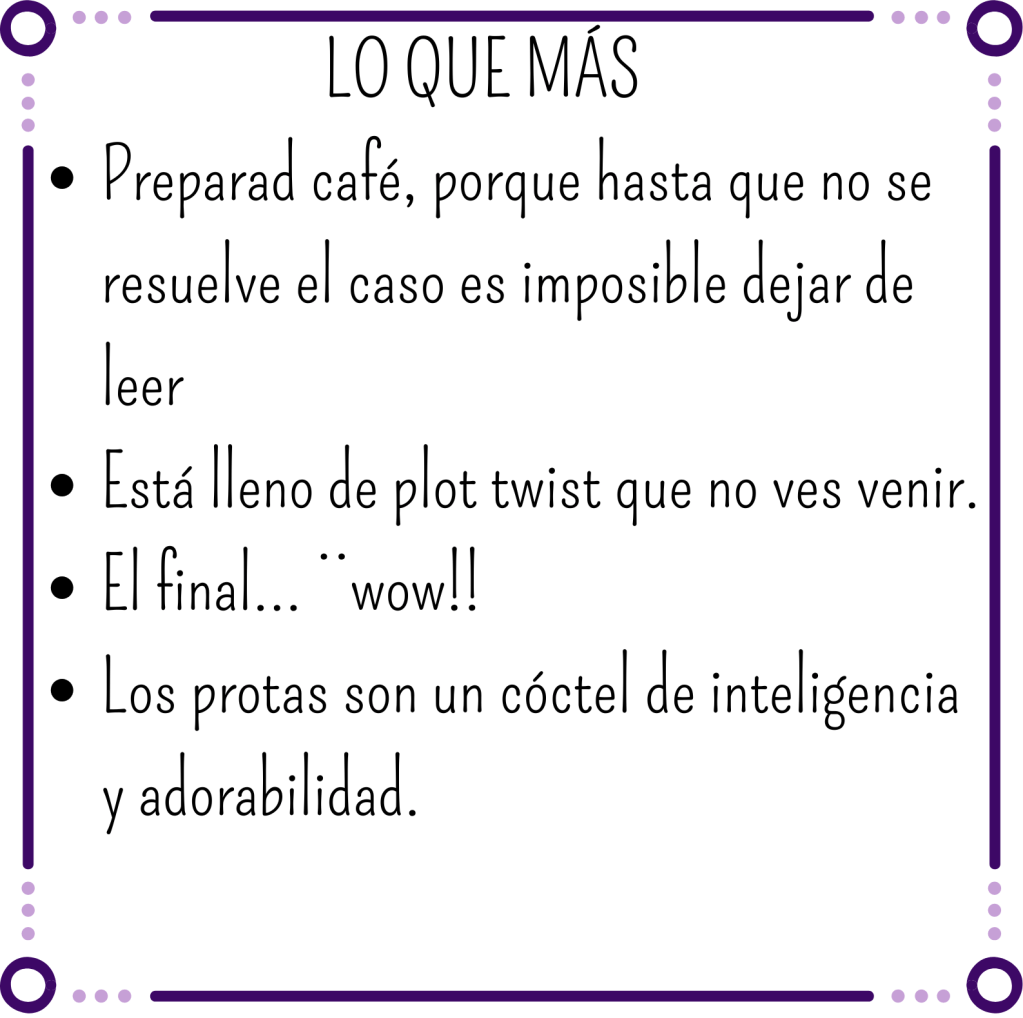 Me ha sorprendido muchísimo, y eso en un thriller me parece imprescindible, porque muchos libros de este género fallan en los desenlaces y me dejan sabor agridulce. En este caso no ha sido así porque el final hace justicia a todo el resto del libro.