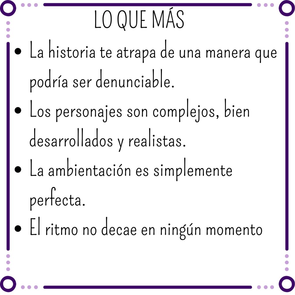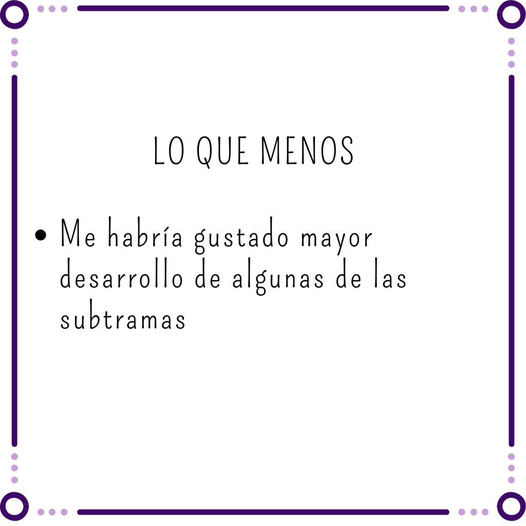 Es verdad que me habría gustado más desarrollo de algunas de las cosas que suceden pero igualmente el vacío que me ha dejado el libro ha sido tremendo. Me ha entretenido tanto y me ha tenido tan metida en la historia que el bajón post lectura ha sido complicado.