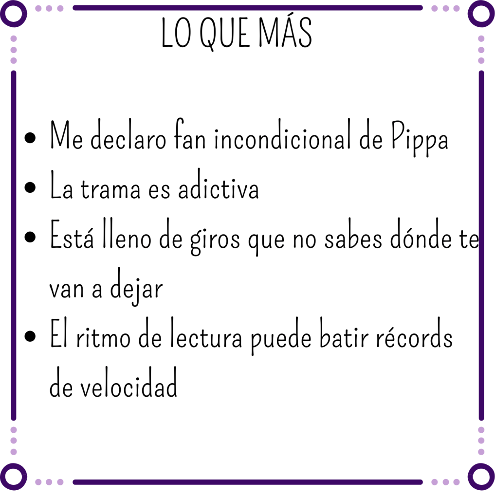 Lo único, que en esta ocasión hace que no tenga una puntuación perfecta es el final, y no porque esté mal, ¿eh? porque está bien y tiene sentido, pero tal vez no me ha impactado tanto como en el libro anterior.
