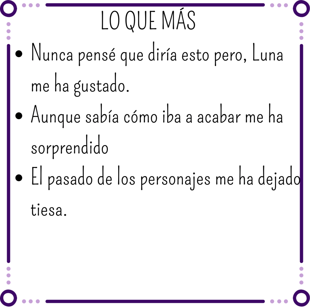 Luna ha sido toda una caja de sorpresas. Me ha sorprendido porque, ahora que la conozco bien, me he visto bastante identificada con su carácter. Es pura coraza porque ha sufrido tanto que es su manera de protegerse. Aun así, aunque cueste empatizar con ella, me ha ganado al saber que también lee “porno de hadas”.