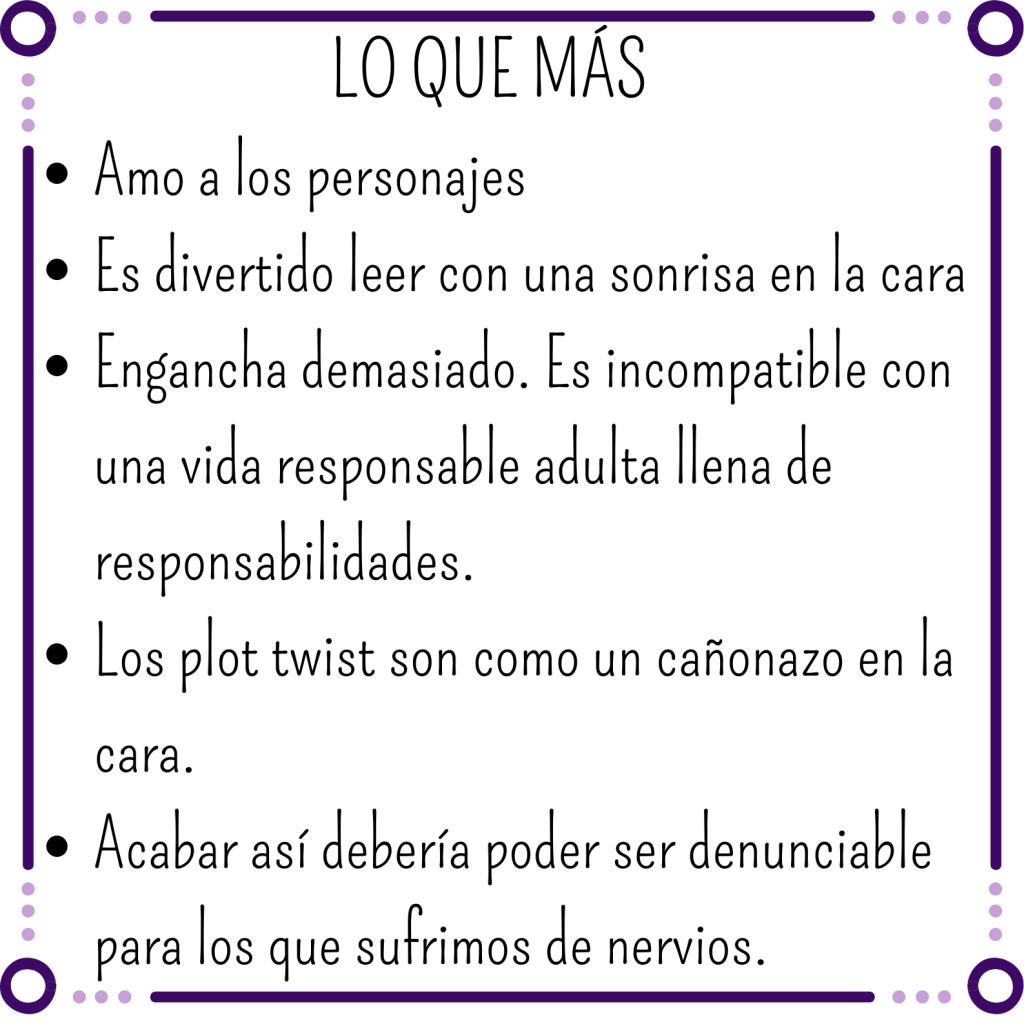 Como ya habréis podido deducir el ritmo es muy ágil, porque a parte de que la trama engancha (os he dicho ya que engancha muchísimo) y estar con los personajes es mejor que estar con los humanos de la vida real, además, hay plot twist repartidos misteriosamente durante todo el libro que no ves venir y que te dejan más de piedra que la Gran Muralla China.