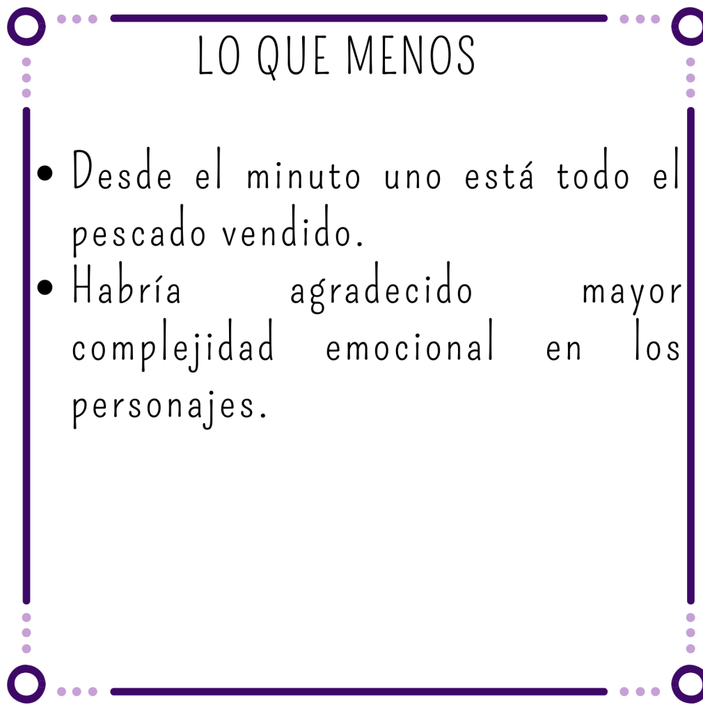 Eso sí, el romance no tiene mucha complejidad. Desde prácticamente el principio está todo el pescado vendido. Que sí, que se a lo que vengo y sé cómo va a acabar, pero es que prácticamente desde la primera interacción entre los dos ya se estaban haciendo ojitos y desnudando con la mirada. Me habría gustado algo un poco menos evidente, aunque el final sea el mismo.