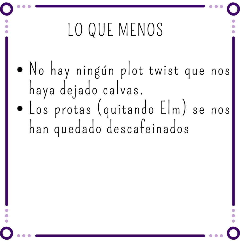 Damos gracias a los dioses por los nuevos POV’S. Conocer a algunos personajes más en profundidad nos ha encantado. Sin duda Elm se ha llevado el protagonismo y nuestro corazón. Nos ha encantado desde el minuto uno (como nos gusta a nosotras un príncipe…).
