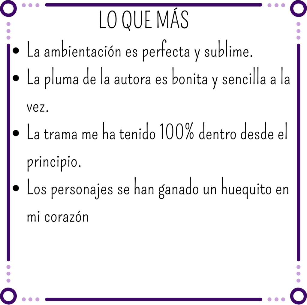 La ambientación es maravillosa. Estamos en pleno Londres Victoriano. La autora tiene una forma de describir las cosas que es muy fácil trasladarse a las fiestas, los bailes, las calles oscuras y peligrosas de Londres. Pero es que además, la prosa es tan delicada y bonita que te mete mucho más en este mundo. Otra cosa que me ha encantado son las referencias a esa época, como Jack el Destripador o las novelas de Sherlock Holmes. Simplemente es perfecto.