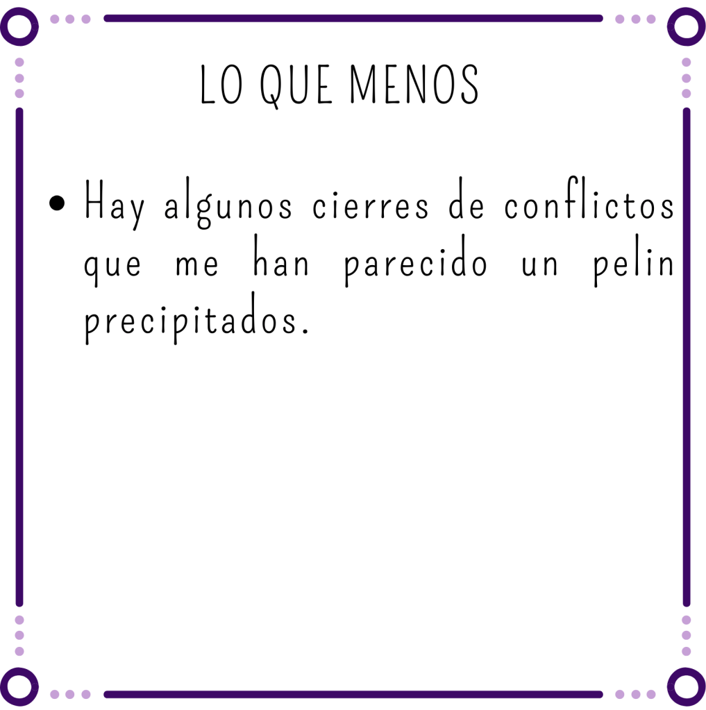 Reconozco que hay alguna resolución que me ha parecido un poco precipitada y que no he entendido muy bien, porque no se le daba mucha importancia hasta el final pero aun así el desenlace me ha gustado. Creo que es el final justo para nuestros personajes.