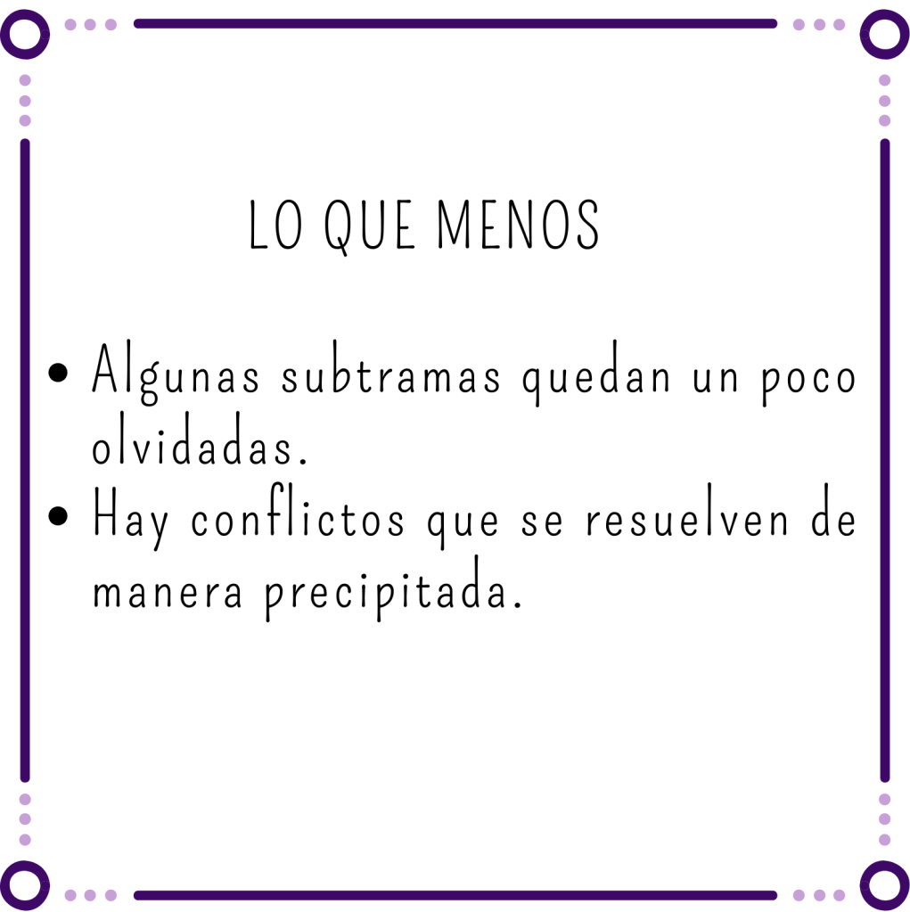 Algo que me ha “decepcionado” es que algunas subtramas pasan desapercibidas y otras se resuelven super rápido. Creo que más desarrollo habría ayudado a una mejor evolución de los personajes.