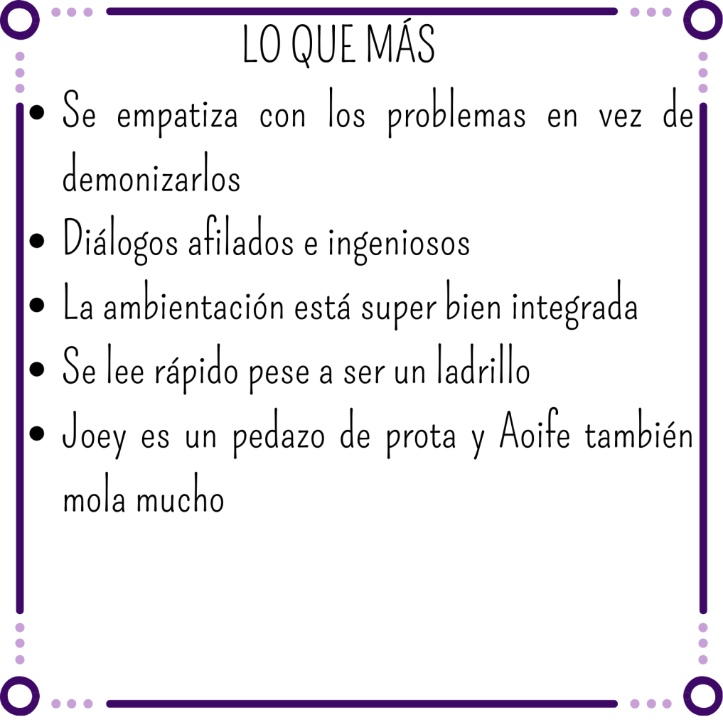 Nos ha gustado ver el arco del personaje completo con sus subidas y caídas. Es importante decir que aquí nos vamos a meter de lleno en una historia de amor tóxica a niveles estratosféricos, y no solo por la parte de Joey, porque aquí nuestra amiga Aoife tiene tela también. Joey es dependiente de las drogas pero Aoife es dependiente de Joey. Y aunque ella es un personajazo, nos ha parecido muy incongruente en lo que decía y lo que hacía, así que en alguna que otra ocasión hemos querido zarandearla para que espabilase.