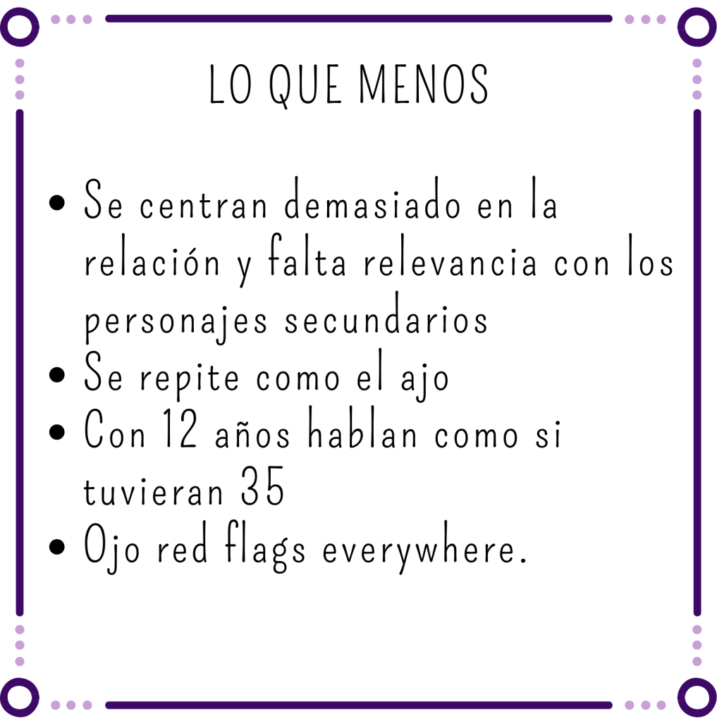 Eso sí, no es para nada un libro juvenil y hay más red flags de las que podemos contar.