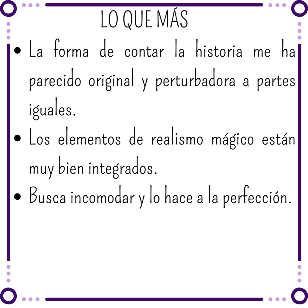 Aun así, habla del odio, del rencor (esa carcoma que todos tenemos dentro…) y la venganza, mezclado con una crítica al clasismo, a la lucha de clases post guerra civil hablando de ambos bandos así como la reivindicación de la memoria histórica y de la necesidad de la sororidad. Y aunque todo esto está presente a lo largo de la historia, a mi algunas veces se me diluía un poco y perdía fuerza.