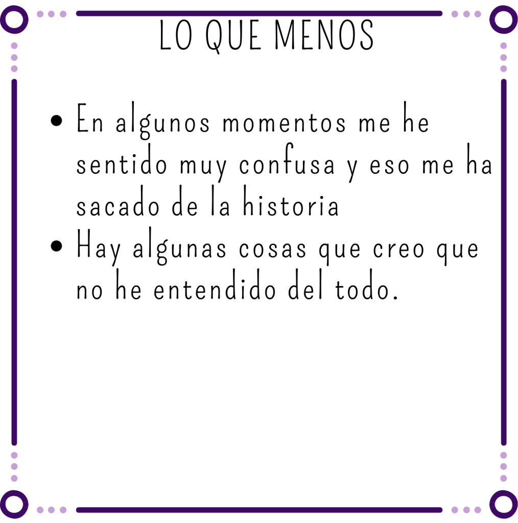 Otra cosa que me ha pasado con los personajes es que me he sentido un poco ambigua. Aunque por un lado he conseguido empatizar con ellas, por diferentes cosas que le pasan, por otro lado me han generado cierta repulsa algunas de las cosas que hacen o dicen. Si es algo que la autora buscaba por mi parte lo ha conseguido al 100%.