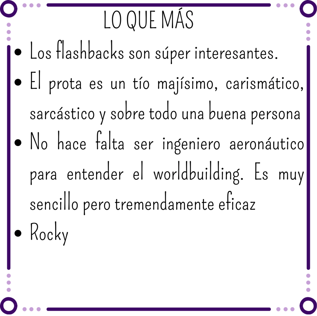 El ritmo no es demasiado ágil, y quizá eso sea lo que más me ha costado. Hay mucho diálogo interno y mucha explicación de lo que Ryland hace en la nave. Eso tiene todo el sentido, ya que la mayor parte del tiempo está solo. Y aunque es un tío simpático y tiene momentos divertidos, esto no ha hecho que me enganchara al libro tanto.