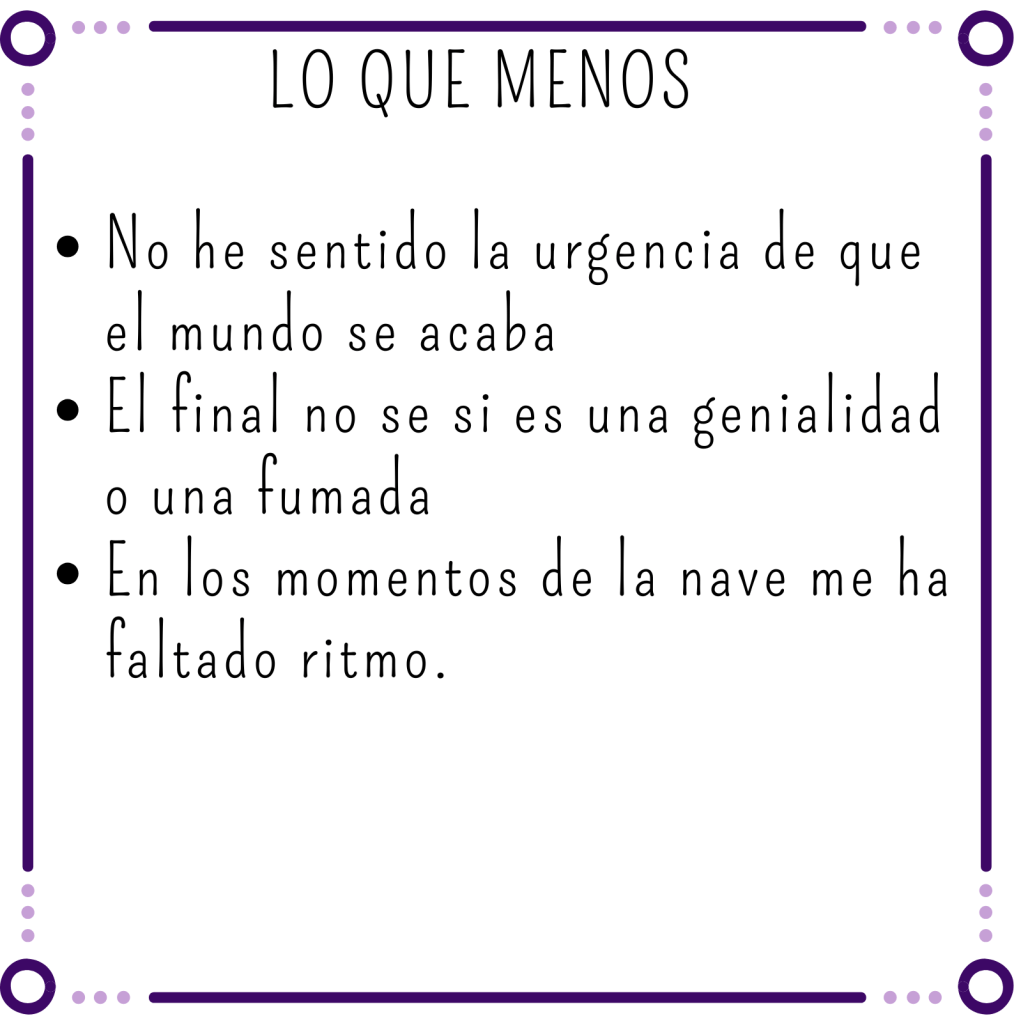 Tampoco es un libro que tenga muchas sorpresas, aunque algún plot twist sí que hay. De hecho, hay un par de ellos concretamente con los que se me ha puesto el corazón en un puño, pero no muchos más.