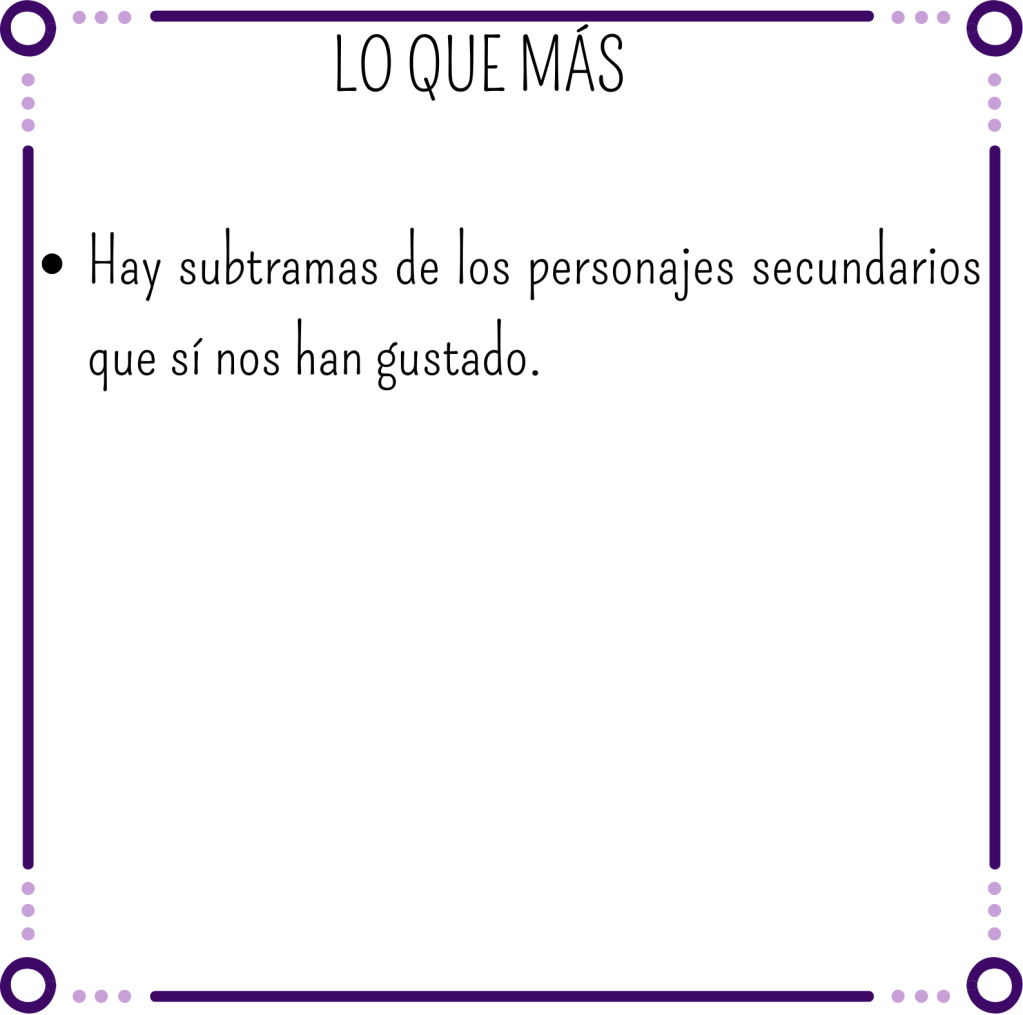 Damos gracias a que hay diferentes subtramas que nos han entretenido algo más que la trama de Auren y Slade, aunque también os decimos que tampoco hace falta que pasen cosas para que nuestro interés aumente. Sorprendentemente íbamos con expectativas por los suelos, y aunque nos duela en el corazón, ahí han seguido durante toda la historia.