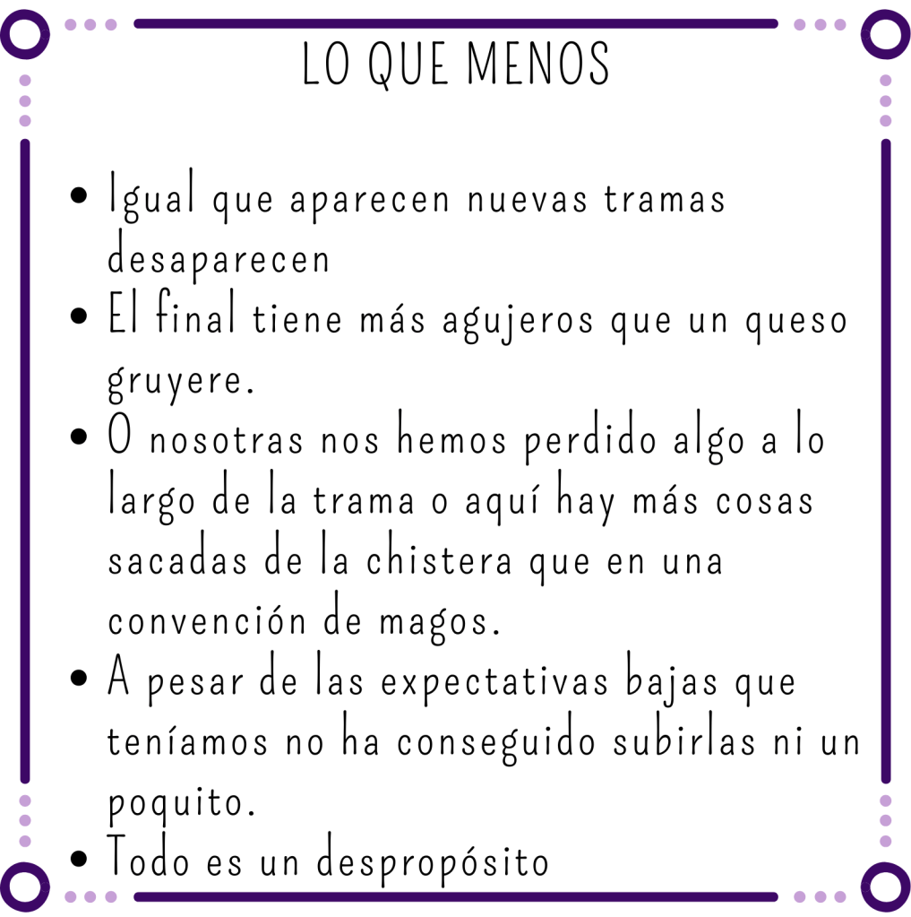 Tampoco hay demasiadas cosas que nos hayan sorprendido. Pasan, las leemos, las aceptamos y continuamos. Entendemos que hay unos cuantos plot twist que pretenden impactar, pero la mayoría nos parecen sacados de la manga porque no tienen relación ni sintonía con la historia.