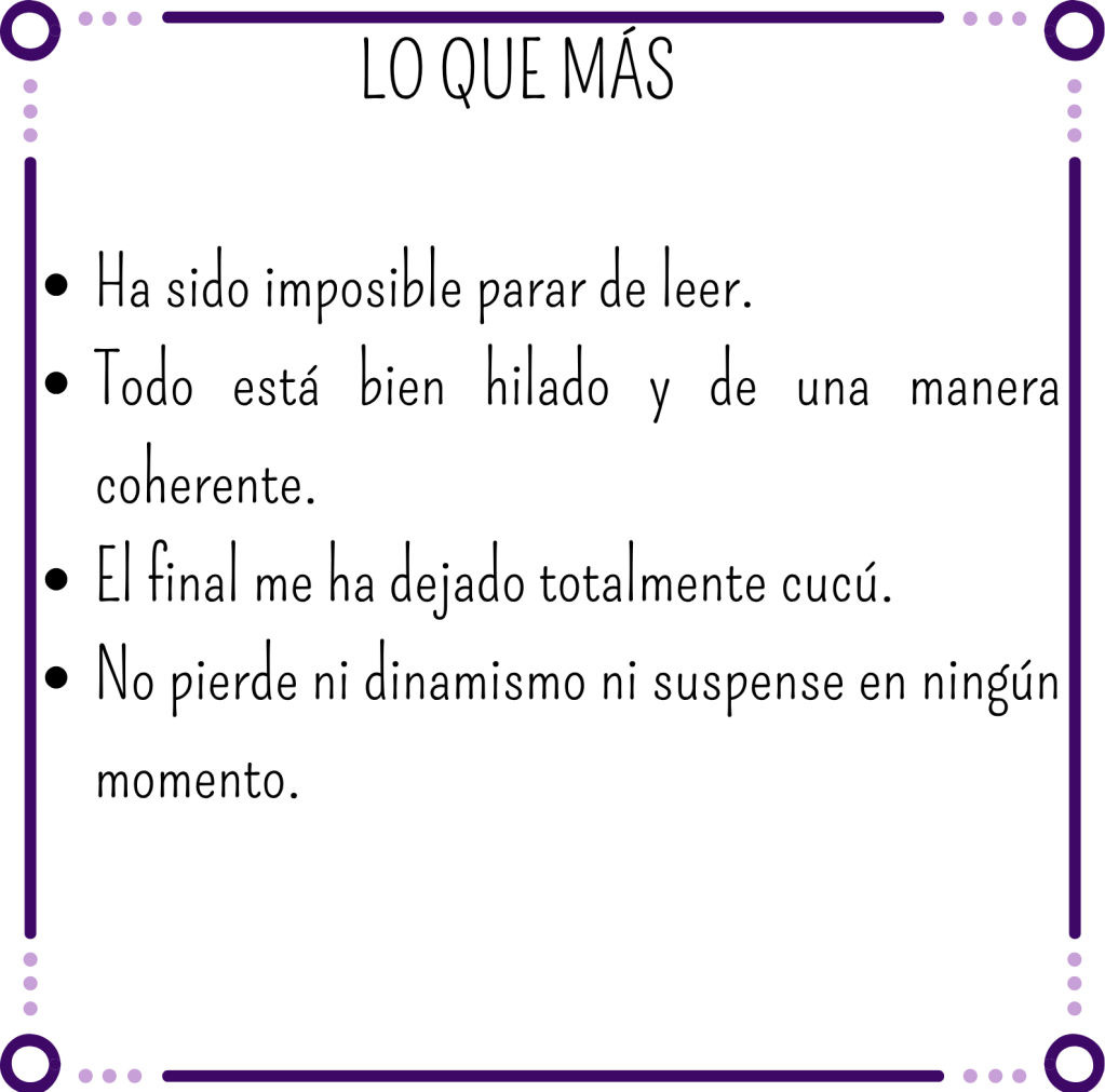 Y como comente antes la verdad es que el final no lo vi venir. Y es que una vez leído y ver que la autora no ha dejado nada en el tintero, te das cuenta de lo obvio que era. La verdad es que a mí no me ha decepcionado ni un poquito y eso que soy bastante tiquismiquis con los finales de los thrillers.
