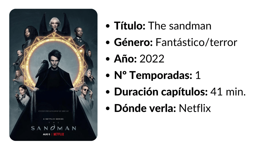 Adaptación del aclamado cómic de Neil Gaiman, que mezcla el mito moderno y la fantasía tenebrosa, y en el que la ficción contemporánea, el drama histórico y la leyenda se entrelazan. ‘The Sandman’ sigue a las personas y los lugares afectados por Morfeo (Tom Sturridge), el Rey del Sueño, mientras repara los errores cósmicos -y humanos- que ha cometido durante su vasta existencia.