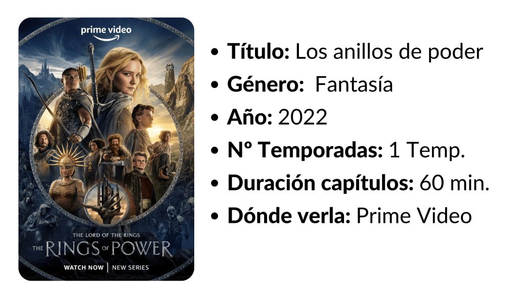En un periodo de relativa calma, los personajes se enfrentan al resurgimiento del mal en la Tierra Media. Desde las profundidades más oscuras de las Montañas Nubladas hasta los majestuosos bosques de Lindon, el impresionante reino insular de Númenor y los confines más lejanos del mapa, estos reinos y personajes esculpirán legados que perdurarán en el tiempo. Serie de TV basada en los libros de J.R.R. Tolkien, ambientada en la Tierra Media, y que explora nuevas líneas argumentales en una época muy anterior a «La comunidad del anillo»