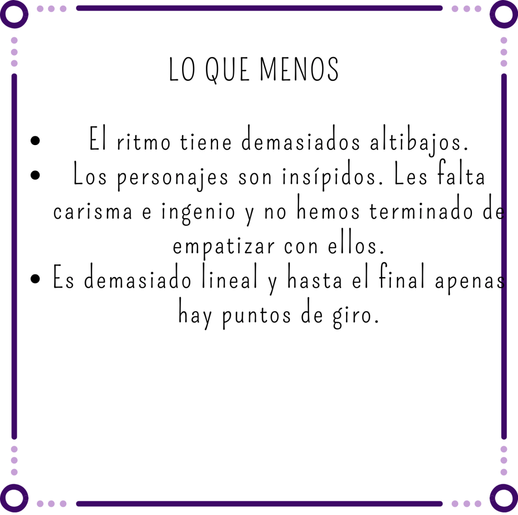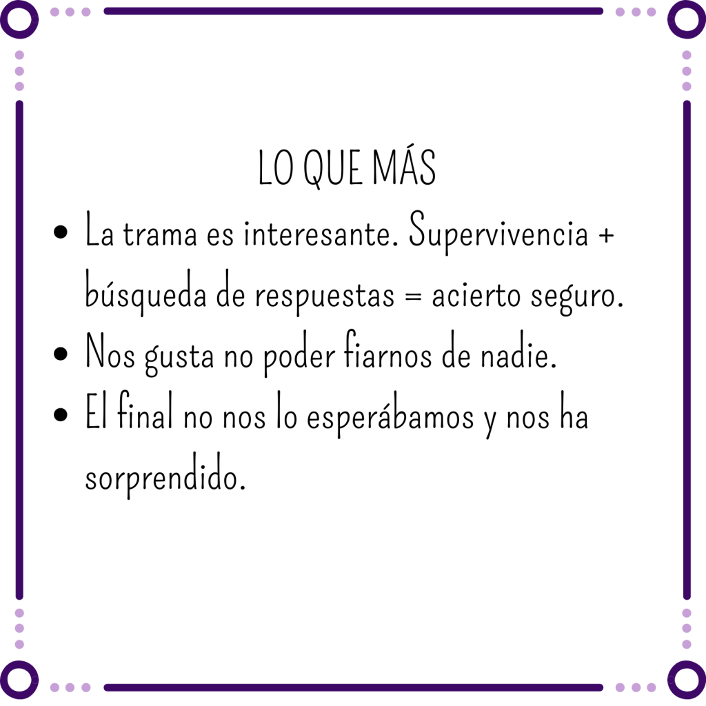 En general es un libro que no está mal pero tampoco tiene nada que lo haga único, creemos que leyendo la sinopsis y con el inicio del libro nos esperábamos algo más de tensión y acción. Es entretenido y original, pero también demasiado lineal y en algunos casos nos ha parecido lento.