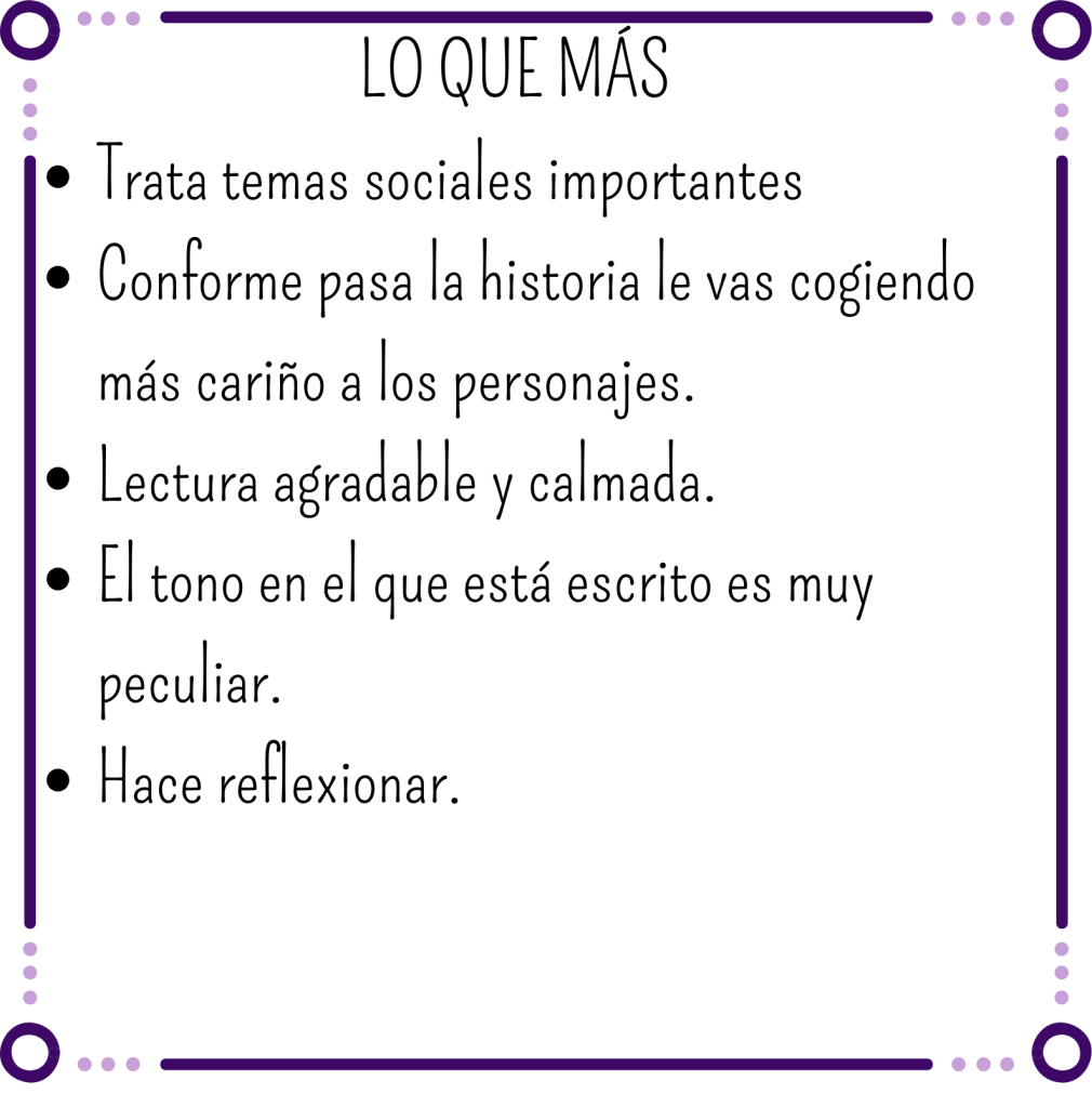 Es una lectura muy agradable de principio a fin porque no es un libro que quieras leer rápido para saber cómo es el final.