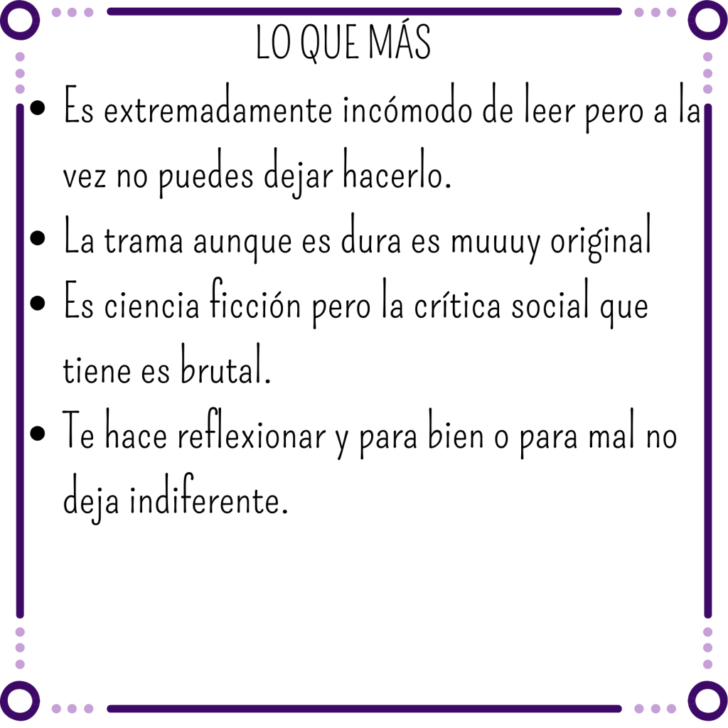 Aun así, es una novela que me ha impactado, me ha hecho reflexionar muchísimo y no me ha dejado indiferente. Creo que es de esas historias que te puede gustar más o menos pero que no se olvidan fácilmente.